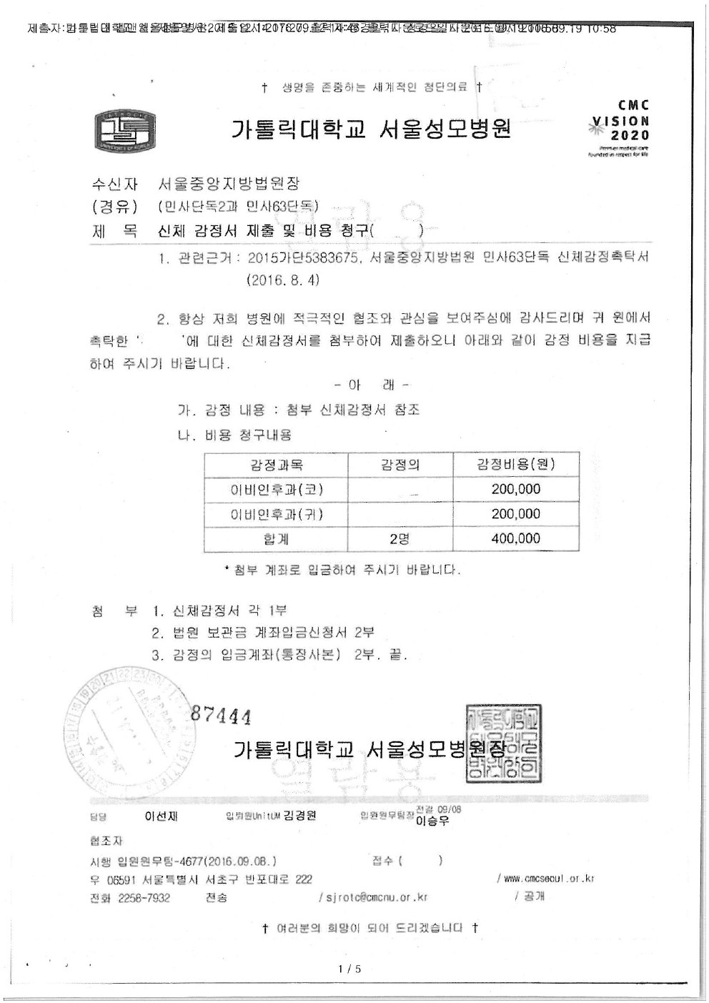 카톨릭대 서울성모병원[후유장해-난청, 이명, 후각소실]