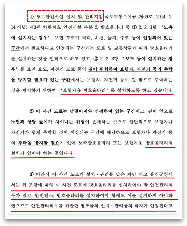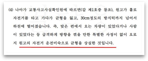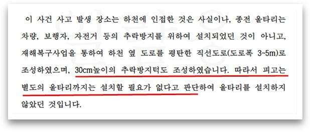 사고 발생 장소에는 추락 방지 턱도 조성하였고 별도의 울타리는 설치할 필요가 없고 원고의 운전미숙으로 사고를 당한 것이라고 주장하였습니다.