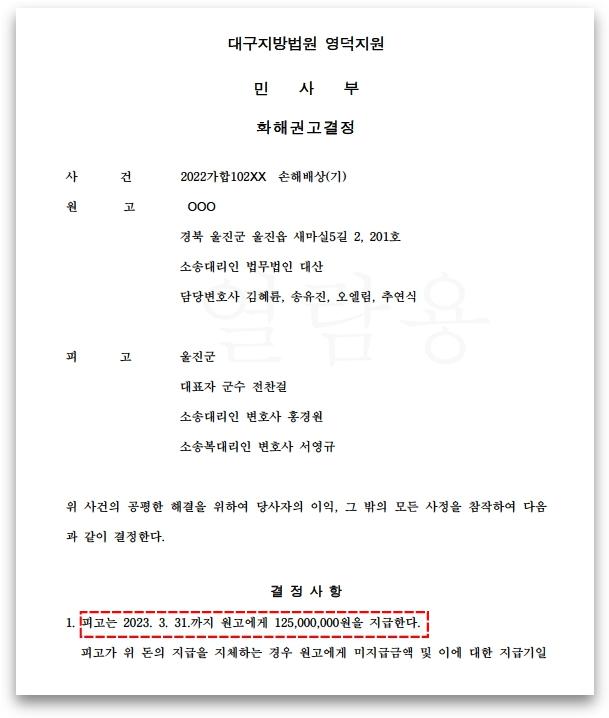재판부에서는 피고의 영조물의 설치·관리상의 하자를 인정 및 원고의 과실을 참작하여 화해권고결정을 하였고 양측 다 이에 승복하여 종결된 사례입니다.