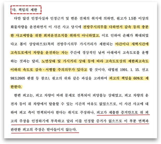 과실이 쟁점이 되었던 사안으로 피고는 피양 불능 상태로 면책을 주장하였으나 재판부에서는 받아들이지 않았고 피고의 과실을 60%로 인정한 사례입니다.