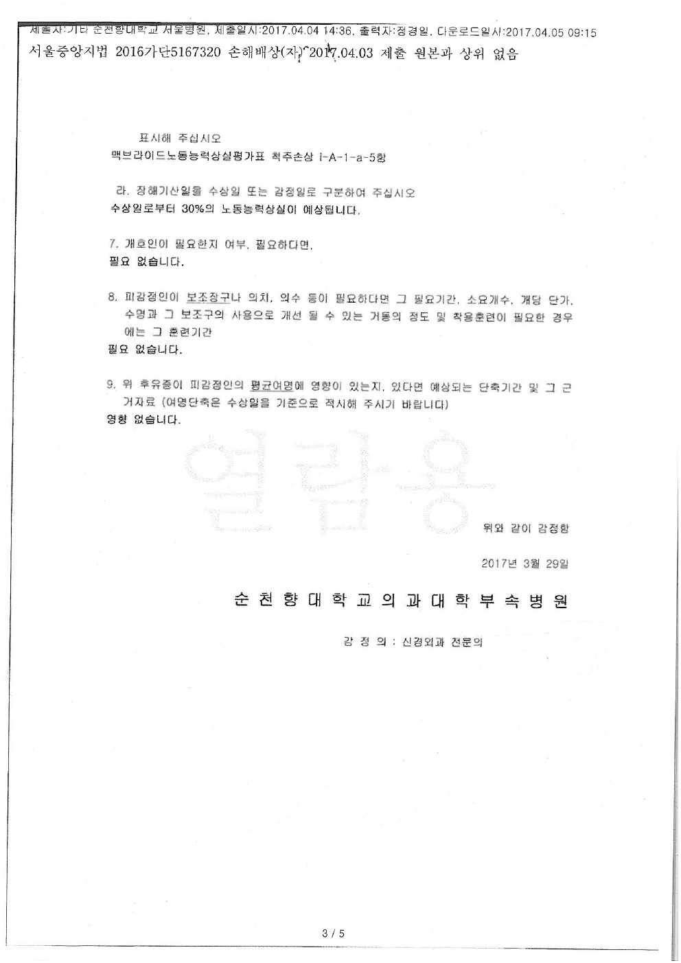 순천향대병원[후유장해-뇌손상 후유증]