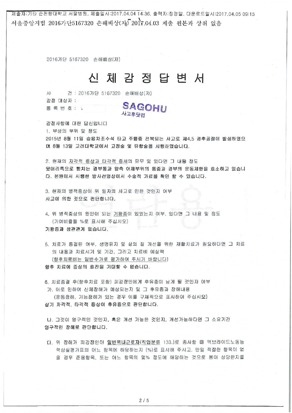 카톨릭대 성모병원[후유장해-추간판 탈출증 유합술]