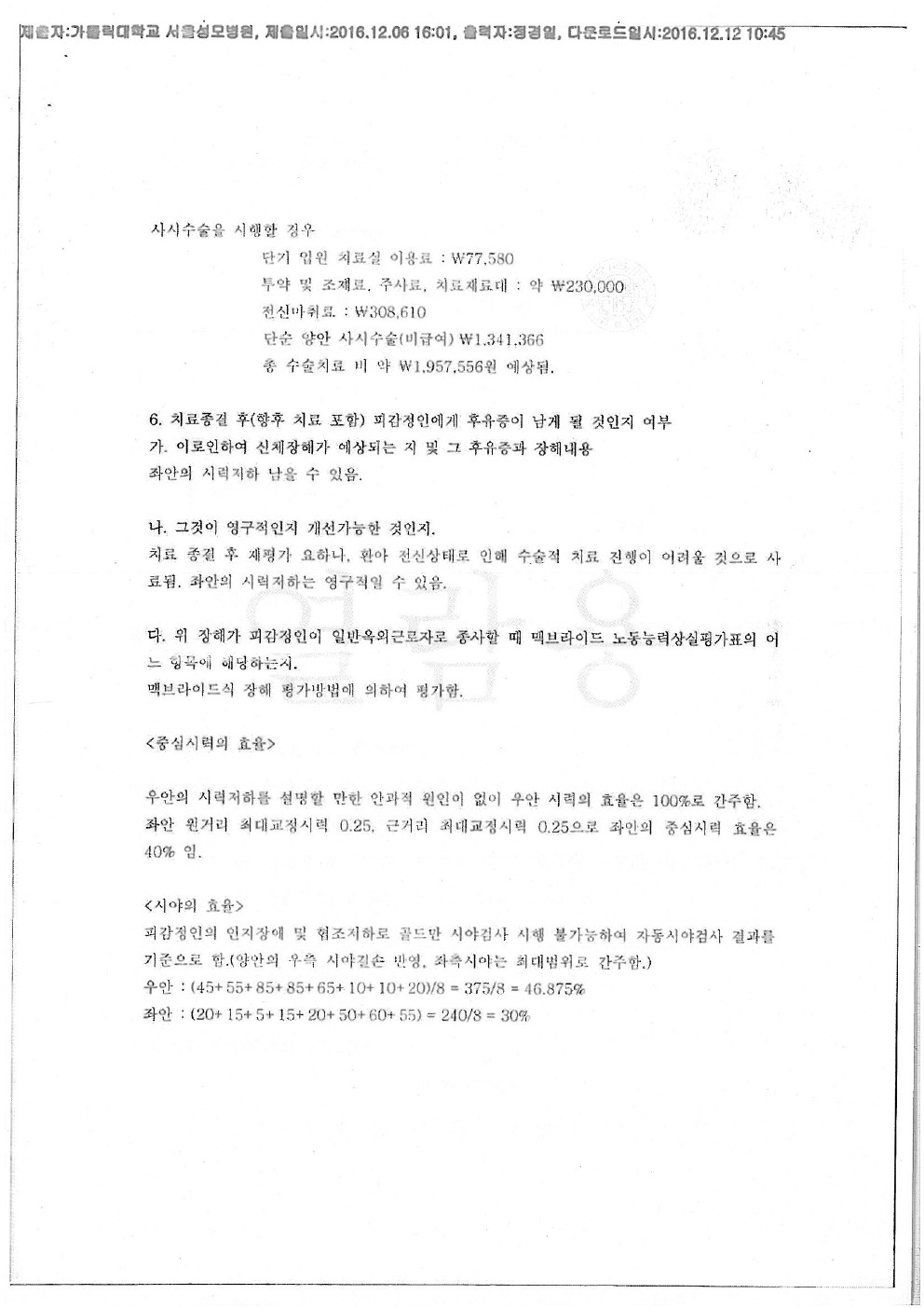 카톨릭대 서울성모병원[후유장해-시각장해]