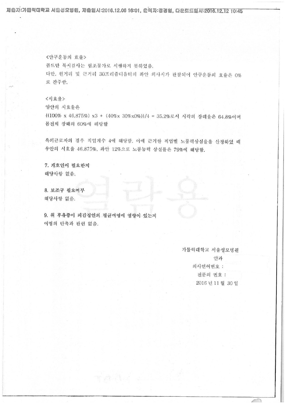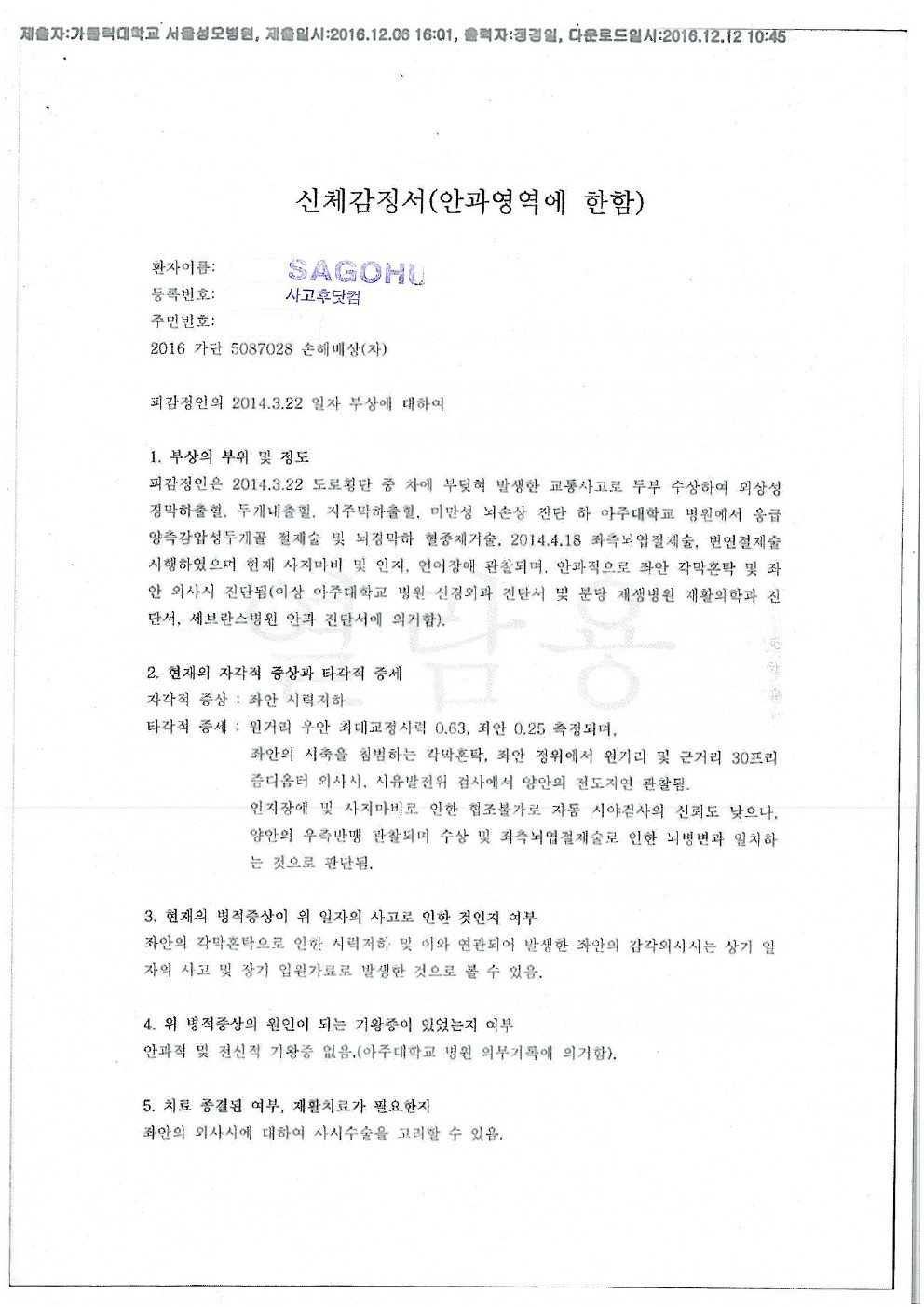 카톨릭대 서울성모병원 [후유장해-뇌손상으로 인한 시야결손 및 시력저하]
