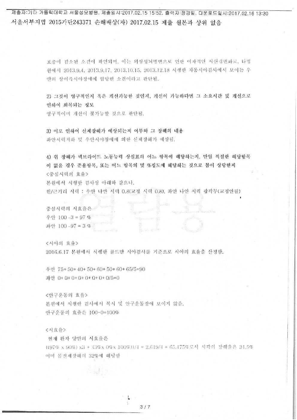카톨릭대 서울성모병원 [후유장해-뇌손상으로 인한 시야결손 및 시력저하]