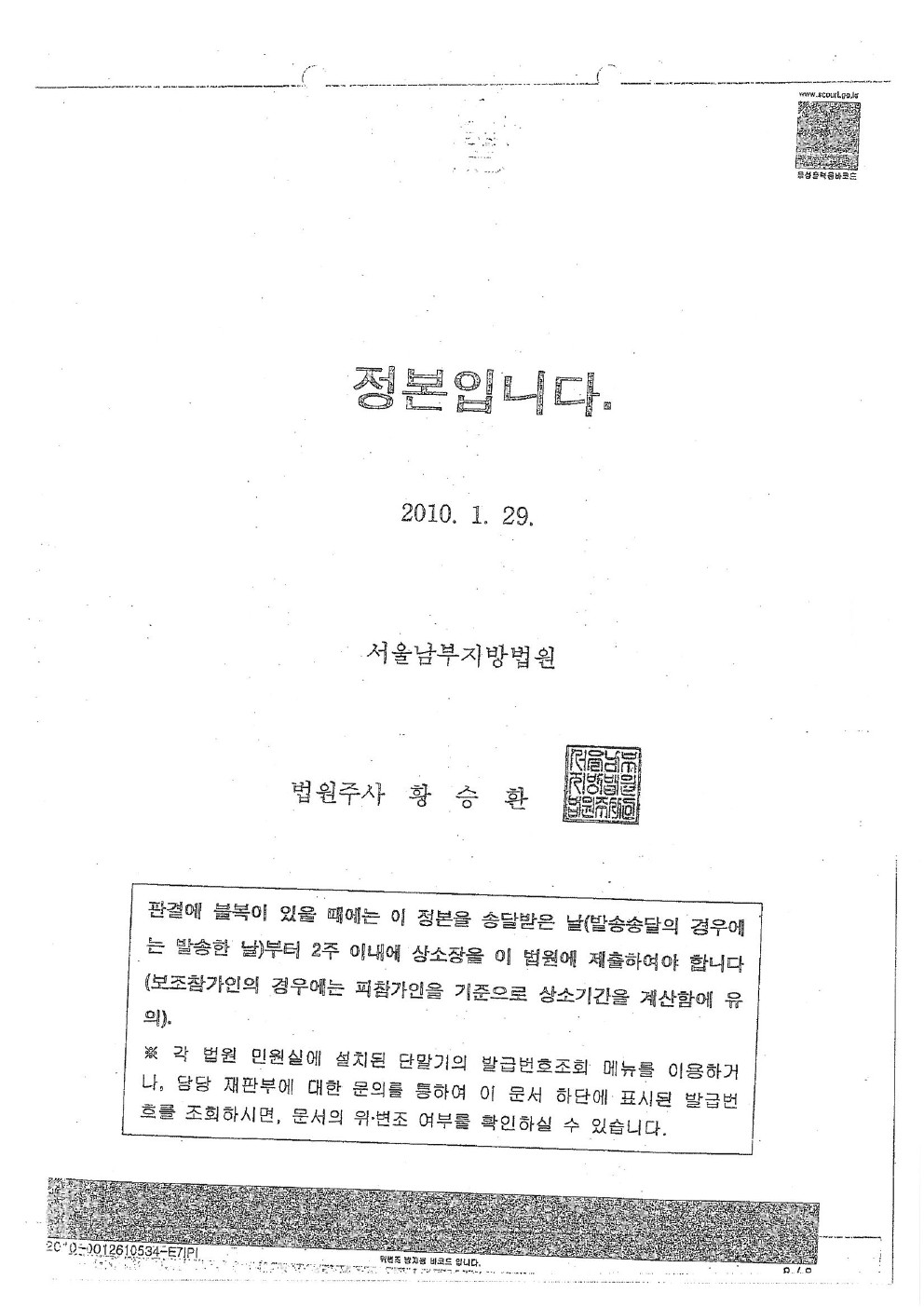 2010년 01월 29일 [ 서울남부지방법원 1심 판결문 ]