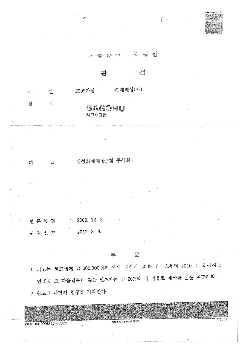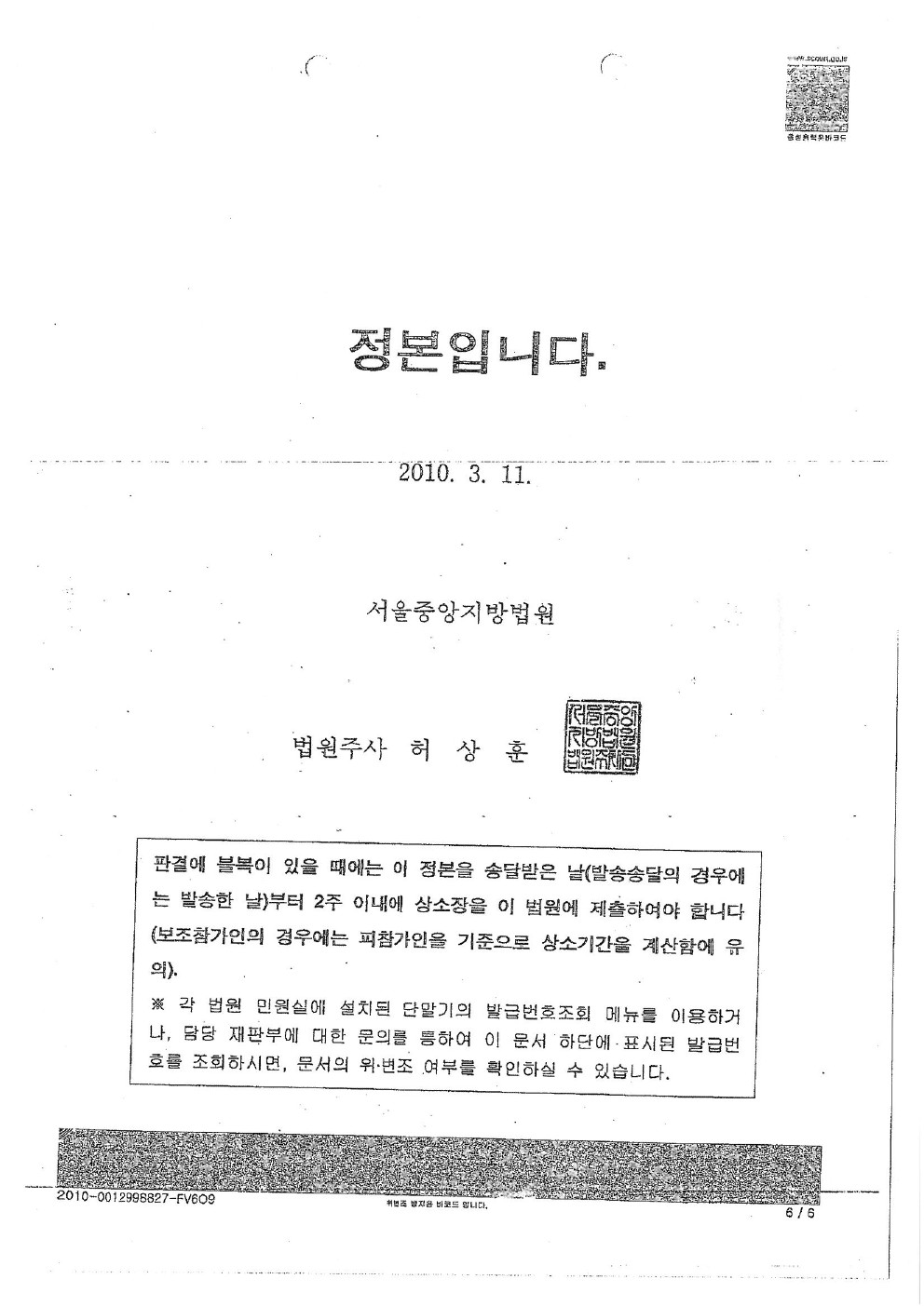 2010년 03월 11일 [ 서울중앙지방법원 1심 판결문 ]