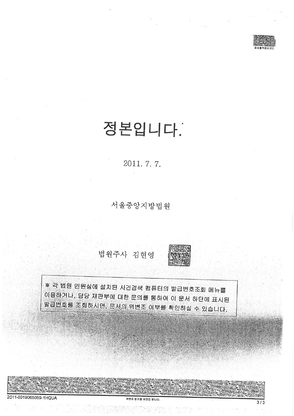 2011년 07월 07일 [ 서울중앙지방법원 1심 화해권고결정문 ]