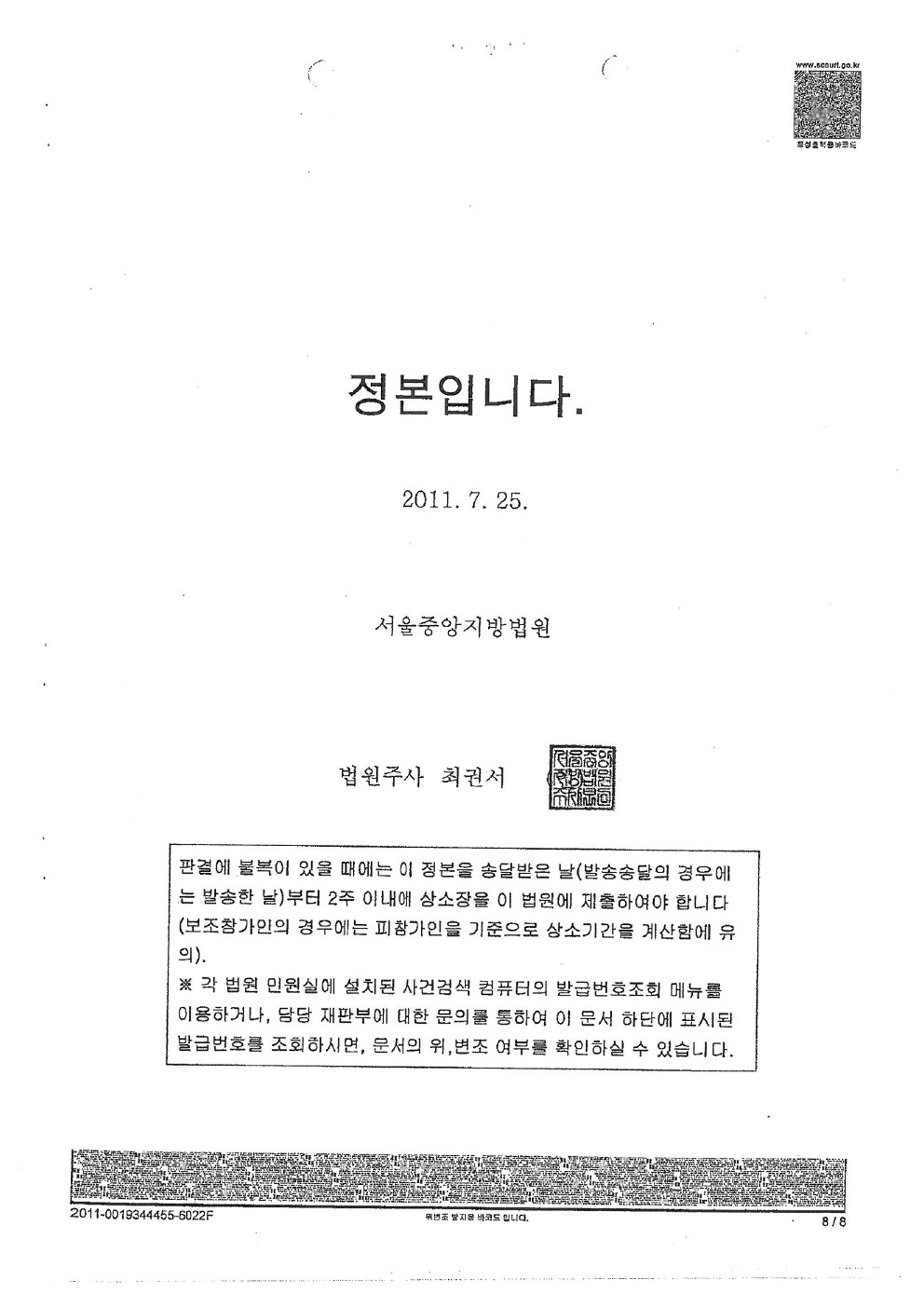 2011년 07월 25일 [ 서울중앙지방법원 1심 판결문 ]