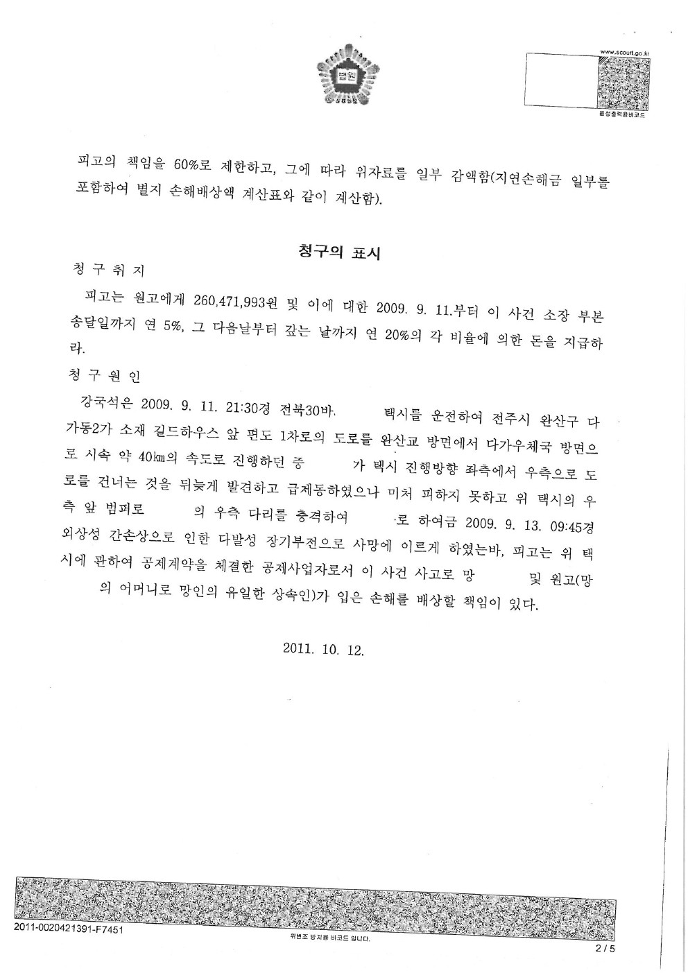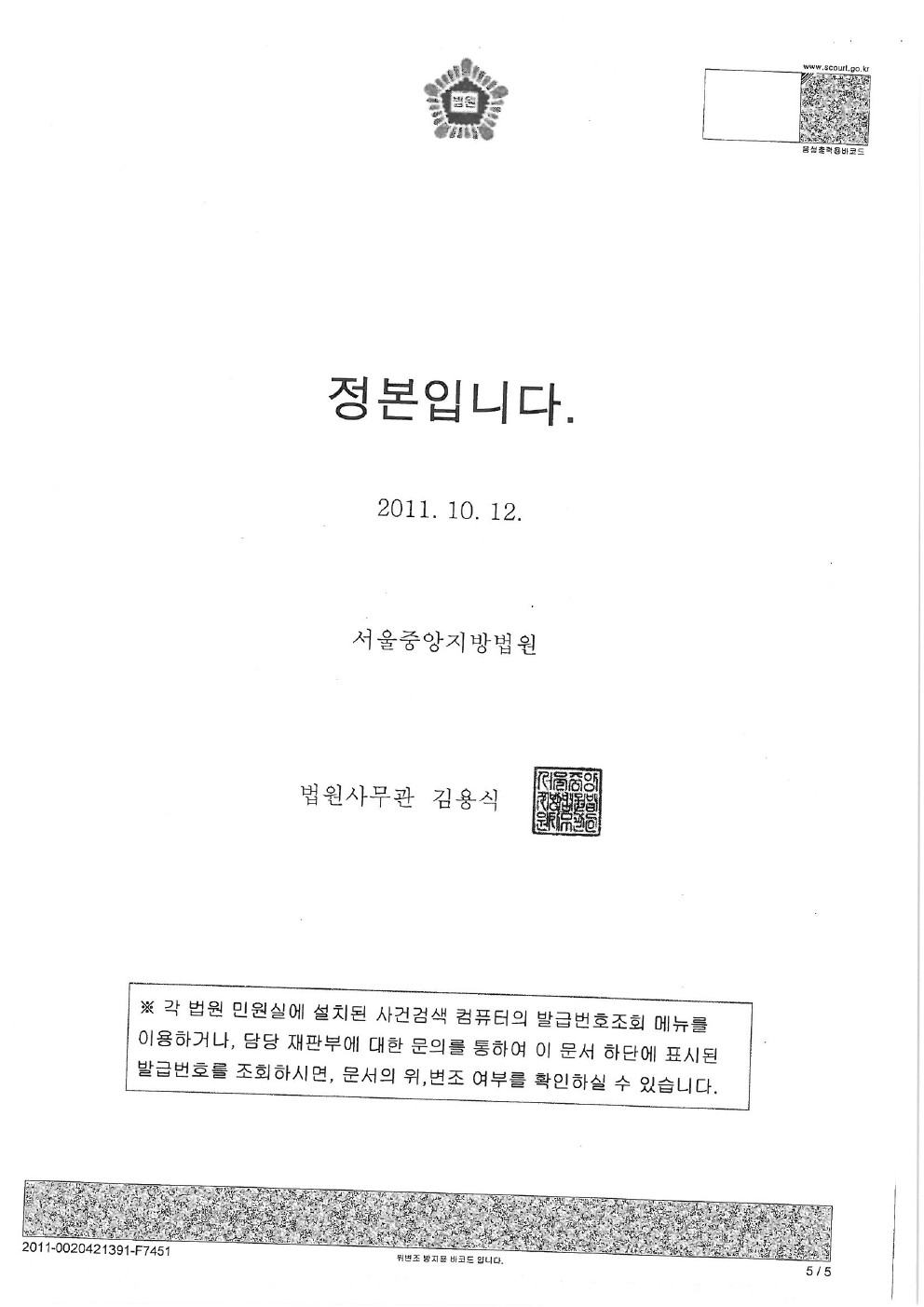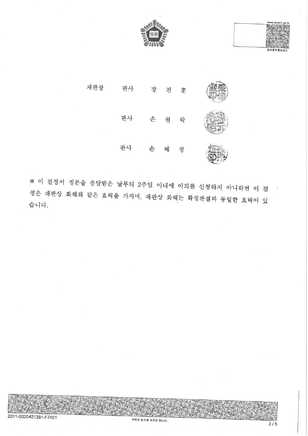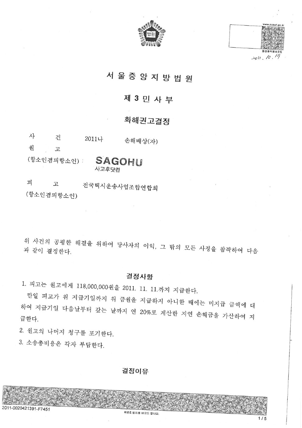 2011년 10월 12일 [ 서울중앙지방법원 2심 화해권고결정문 ]
