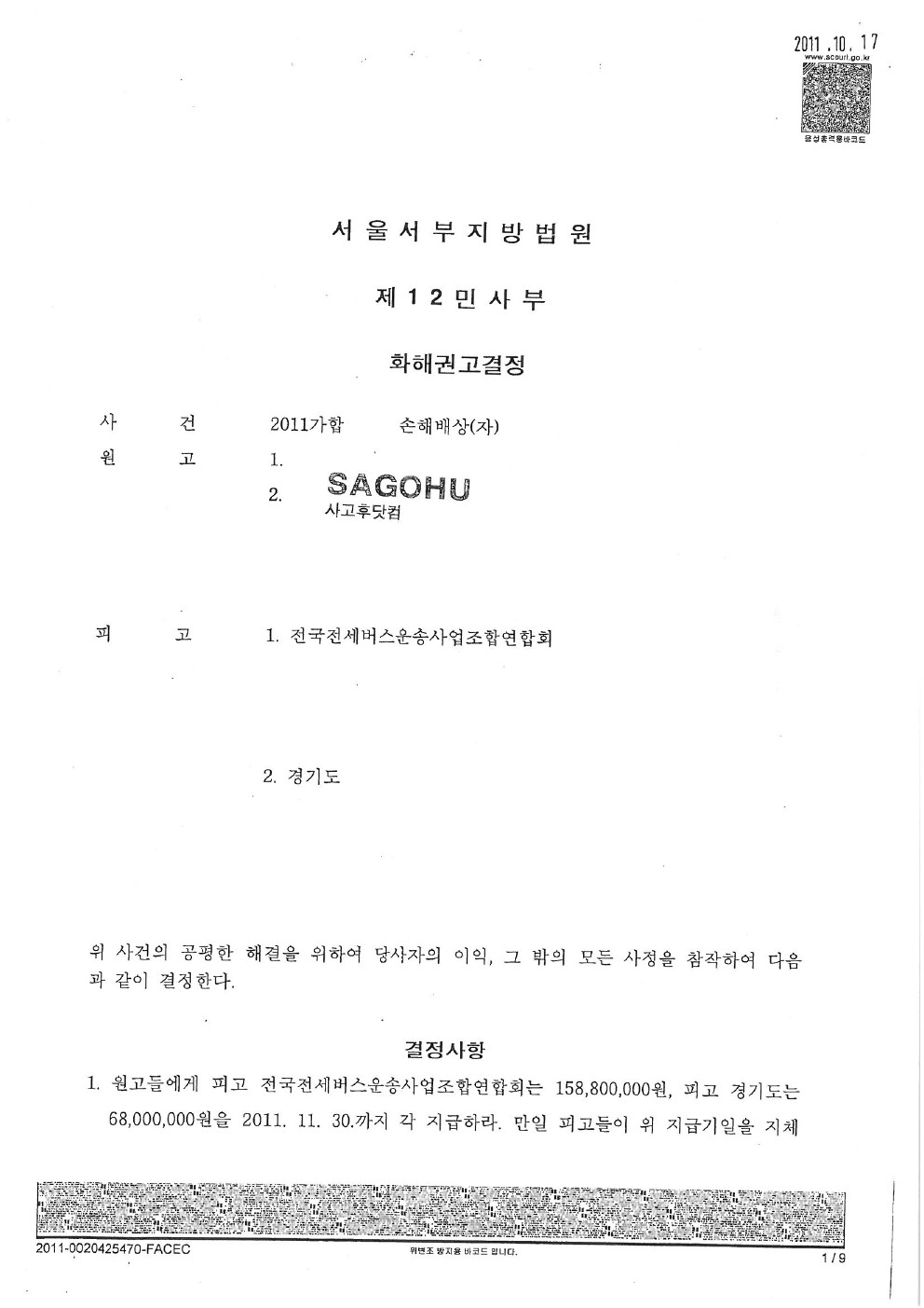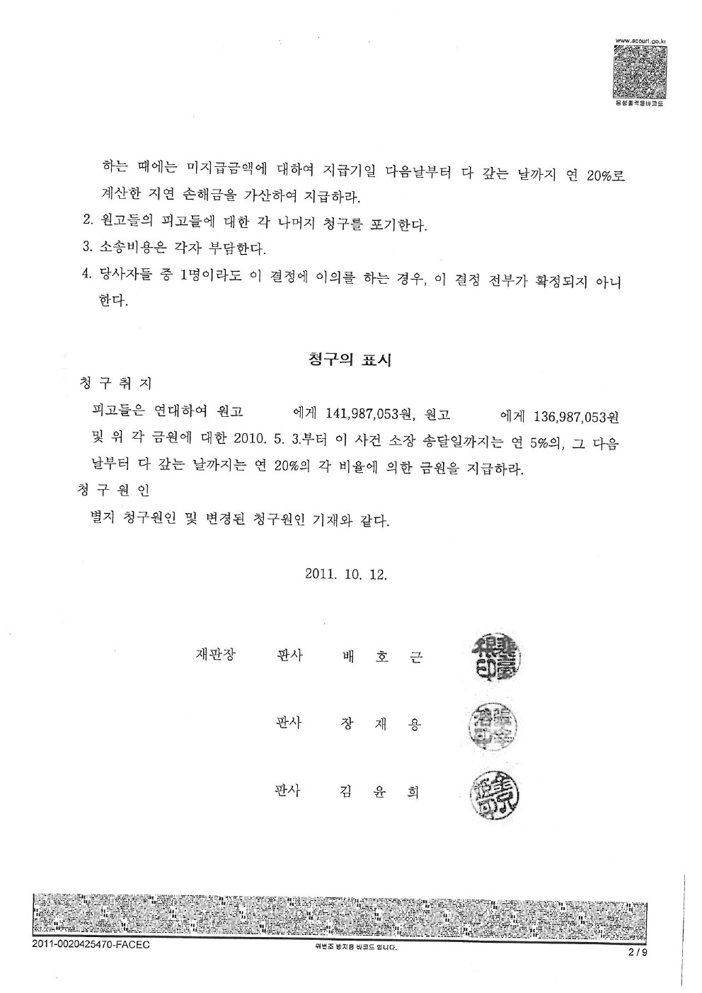 2011년 10월 12일 [ 서울중앙지방법원 2심 화해권고결정문 ]