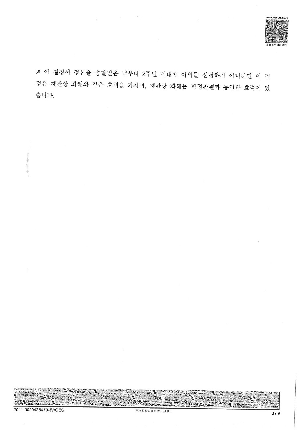 2011년 07월 08일 [ 서울중앙지방법원 1심 화해권고결정문 ]