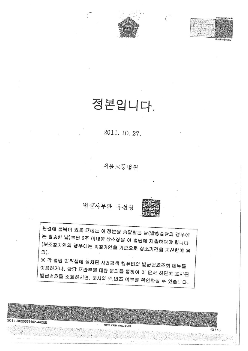 » 2011년 10월 27일 [ 서울고등법원 2심 판결문 ] file 사고후닷컴 2012.06.04 23922
