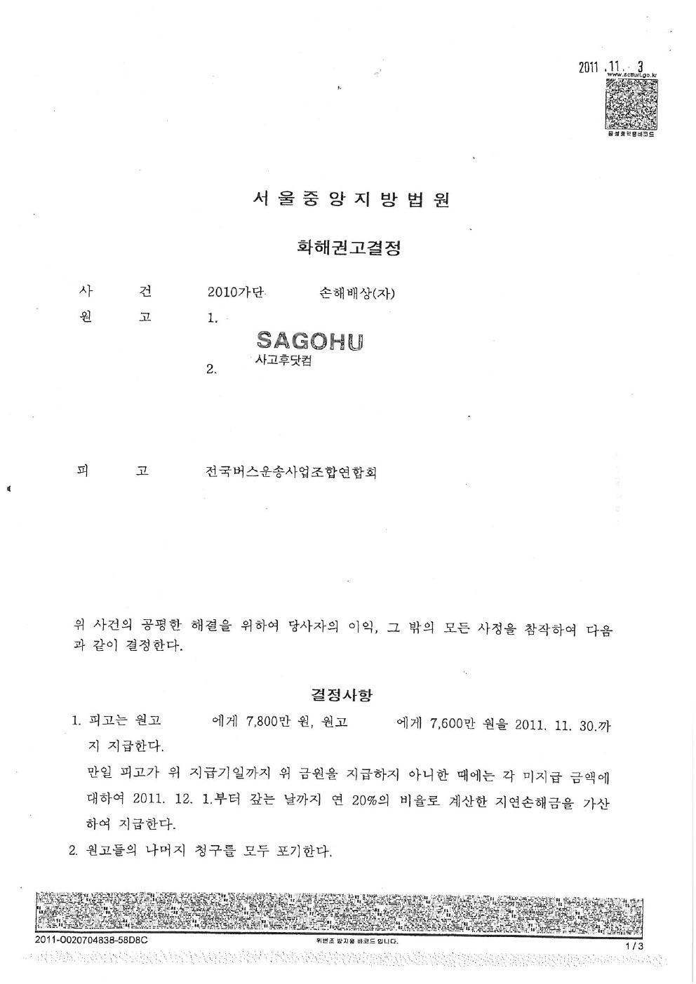 25 2011년 11월 17일 [ 서울중앙지방법원 1심 화해권고결정문 ] file 사고후닷컴 2012.06.05 19291