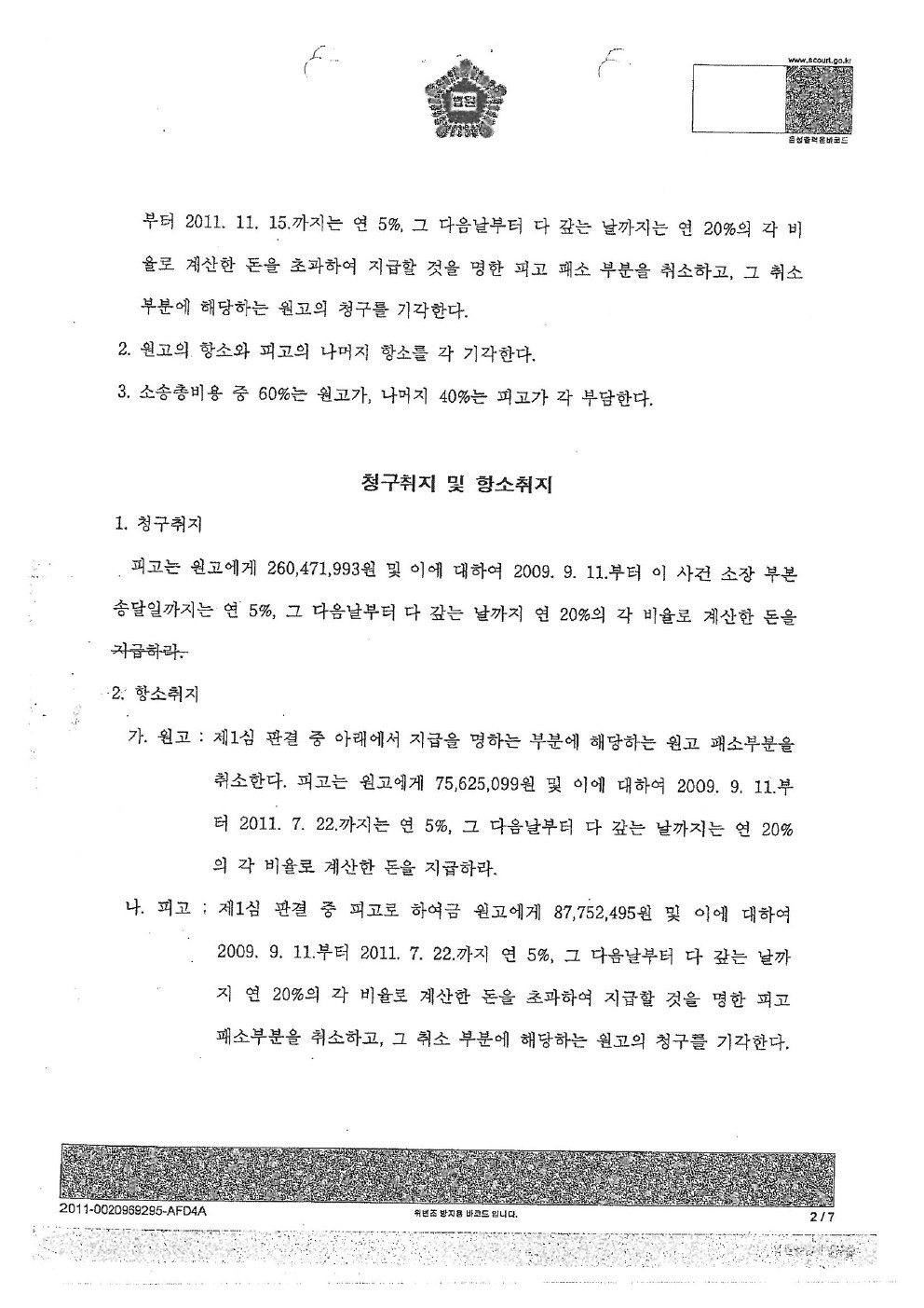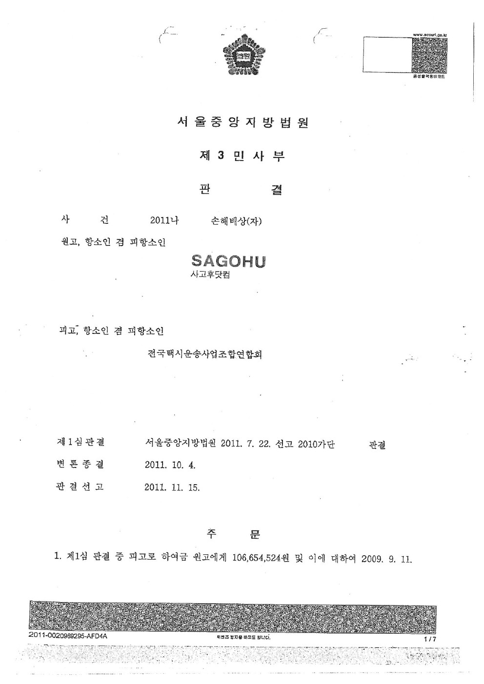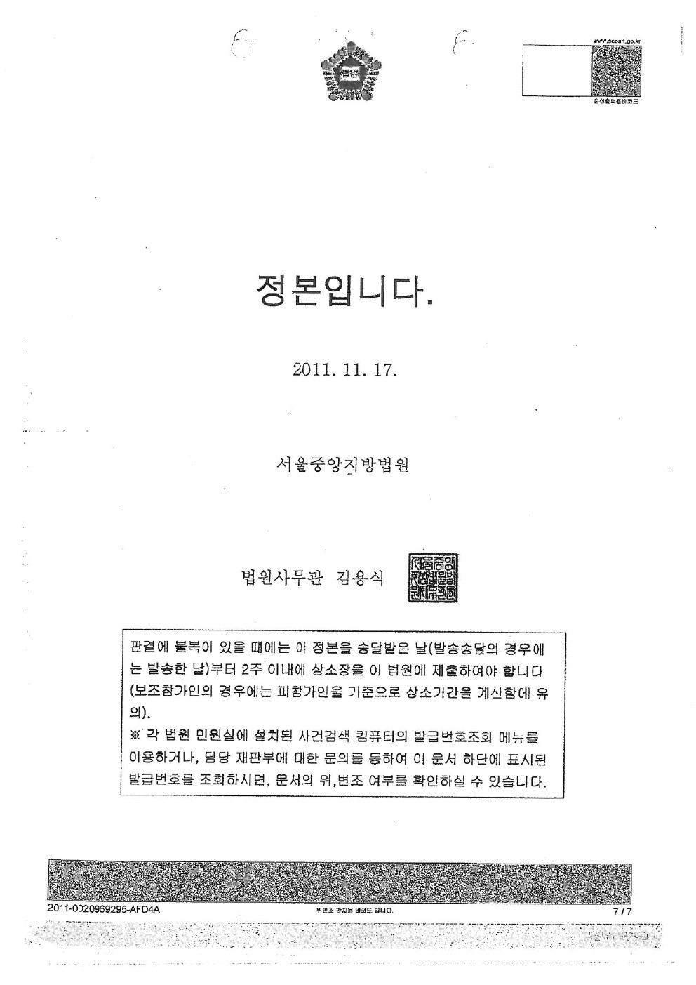 2011년 11월 17일 [ 서울중앙지방법원 2심 판결문 ]