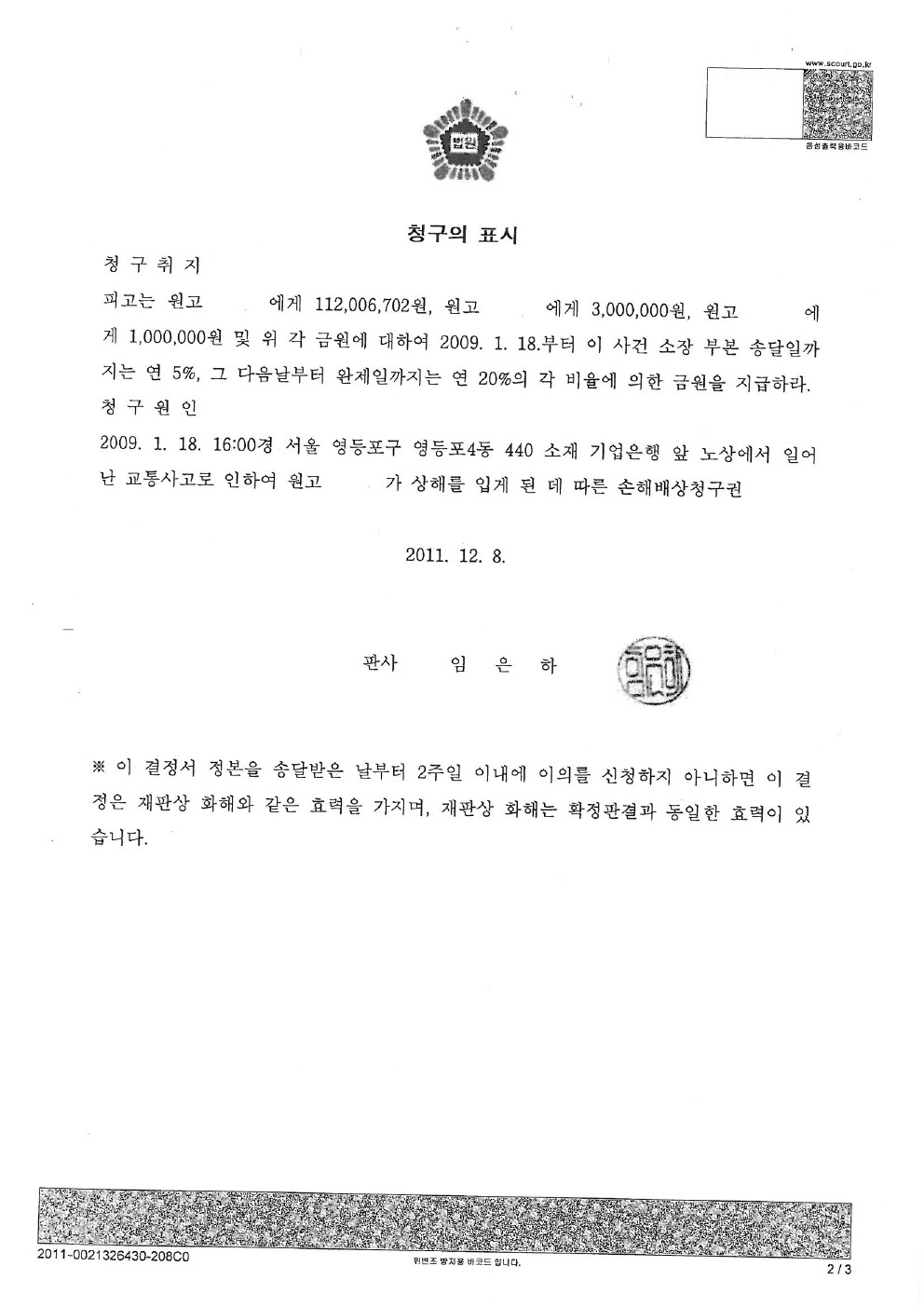 22 2011년 10월 26일 [ 서울서부지방법원 2심 판결문 ] file 사고후닷컴 2012.06.04 16281