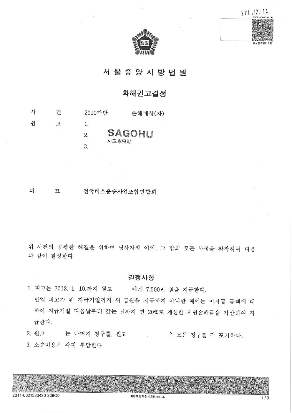 25 2011년 11월 17일 [ 서울중앙지방법원 1심 화해권고결정문 ] file 사고후닷컴 2012.06.05 19291