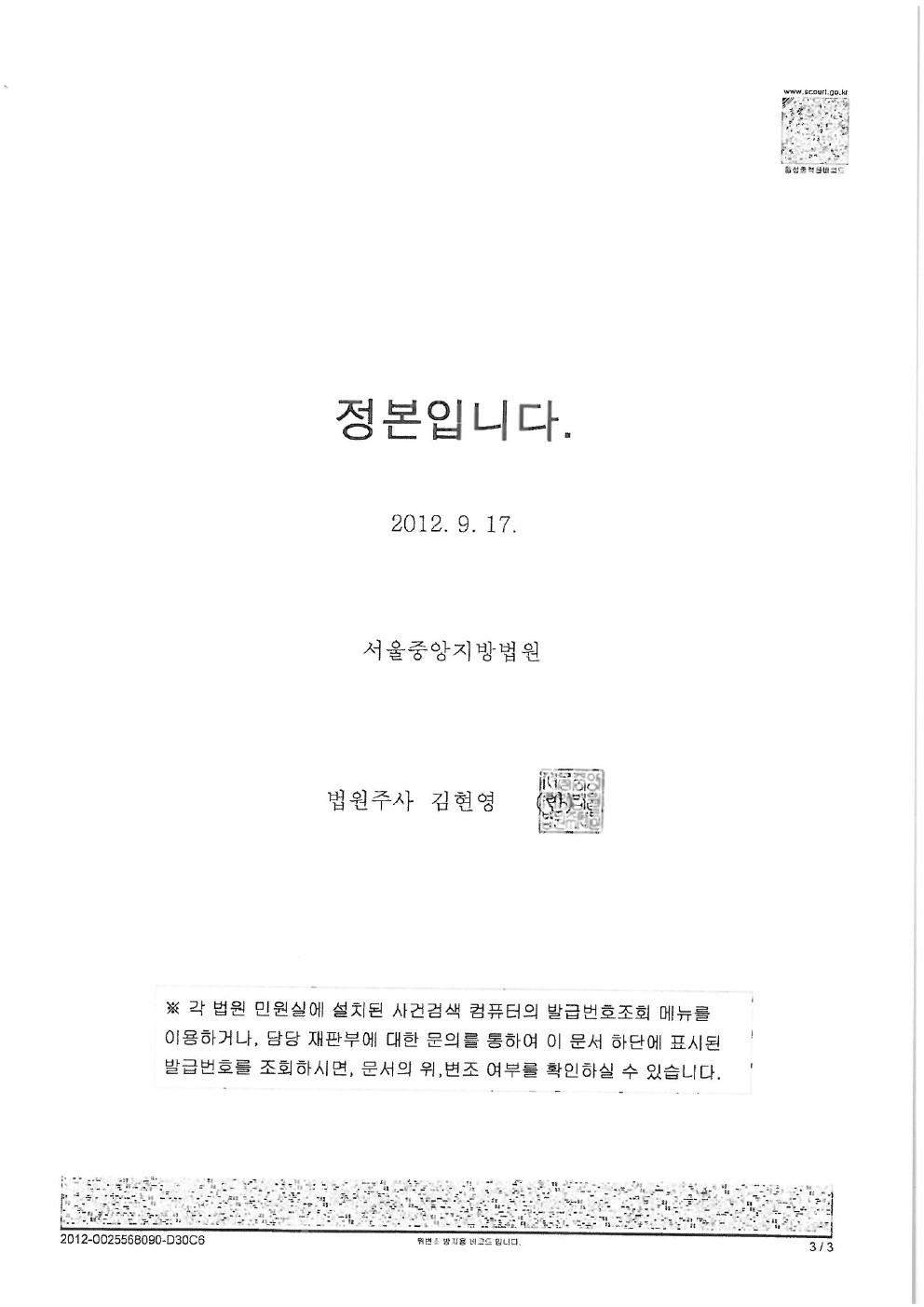 2012년 12월 26일 [서울중앙지방법원 2심 판결문]