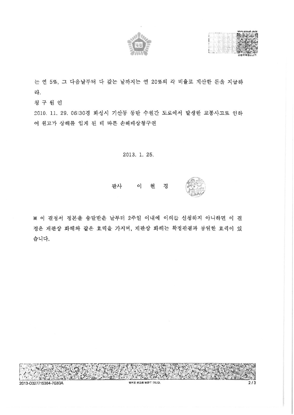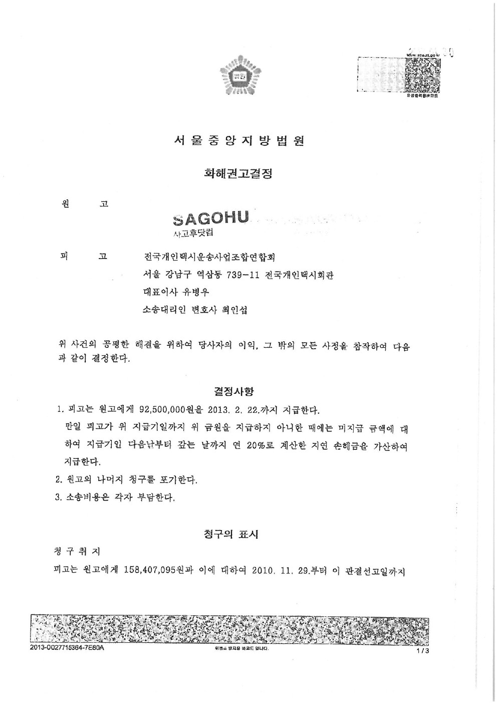 2013년 02월 06일 [서울중앙지방법원 1심 화해권고결정문]