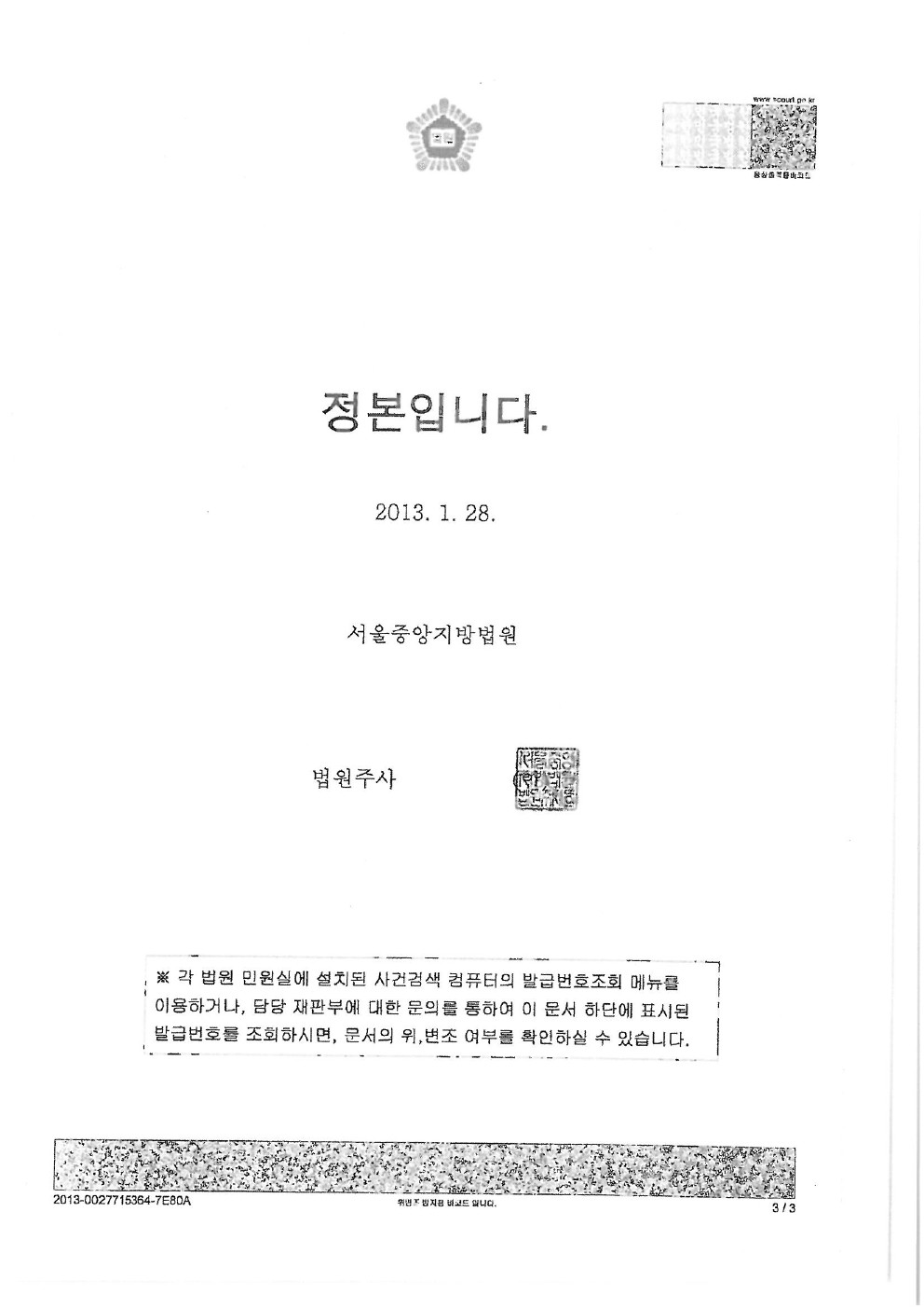 2013년 01월 28일 [서울중앙지방법원 1심 화해권고결정문 ]