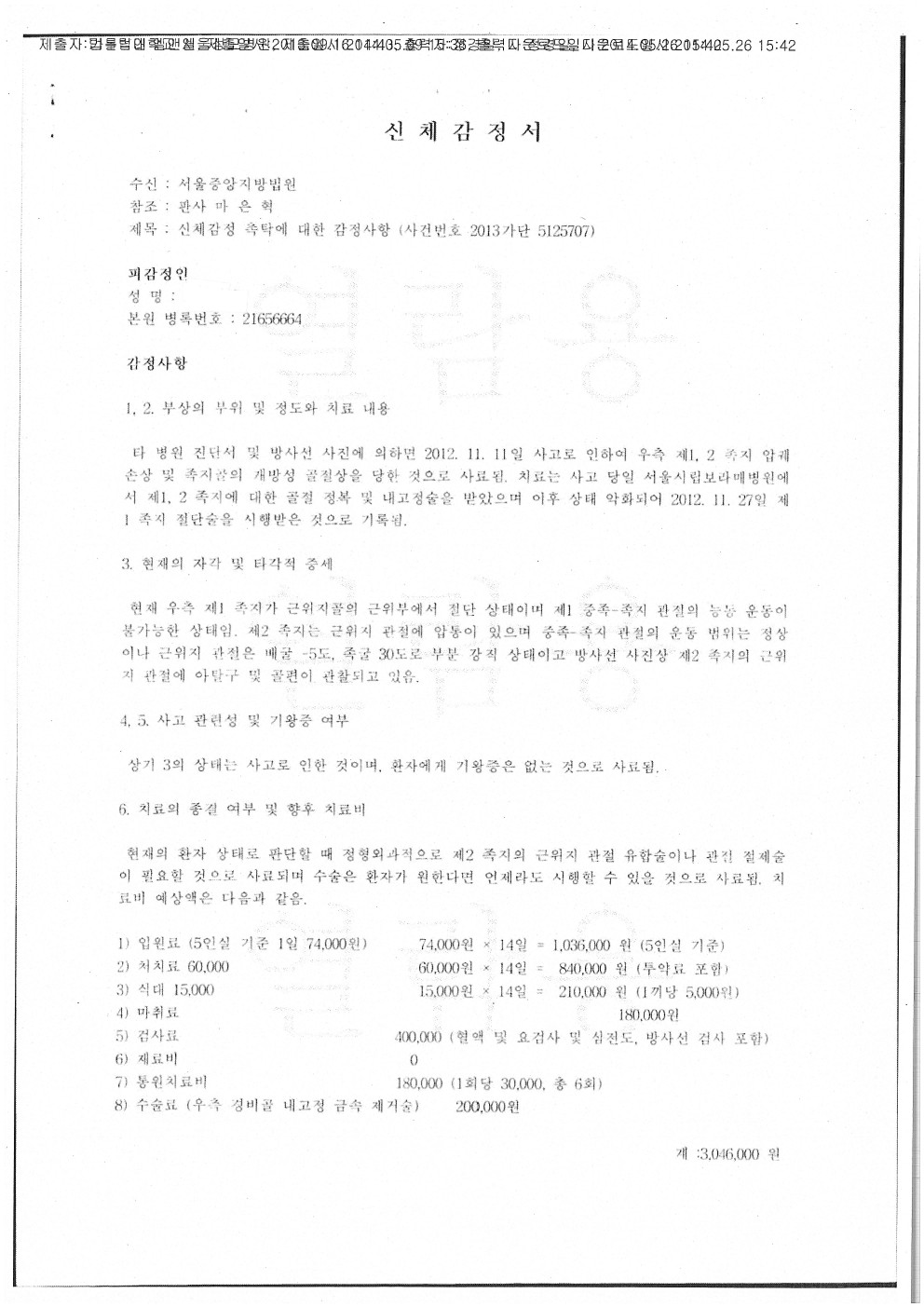 순천향대병원 [후유장해-전방 십자인대 파열, 양측 회전근개 파열]