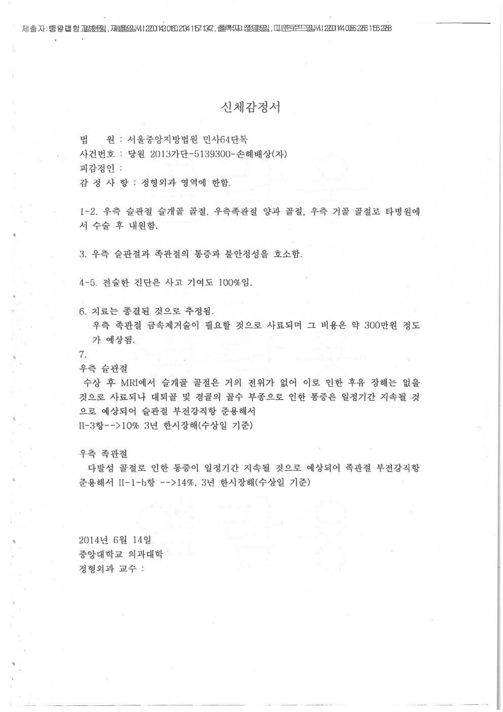 순천향대병원 [후유장해-전방 십자인대 파열, 양측 회전근개 파열]