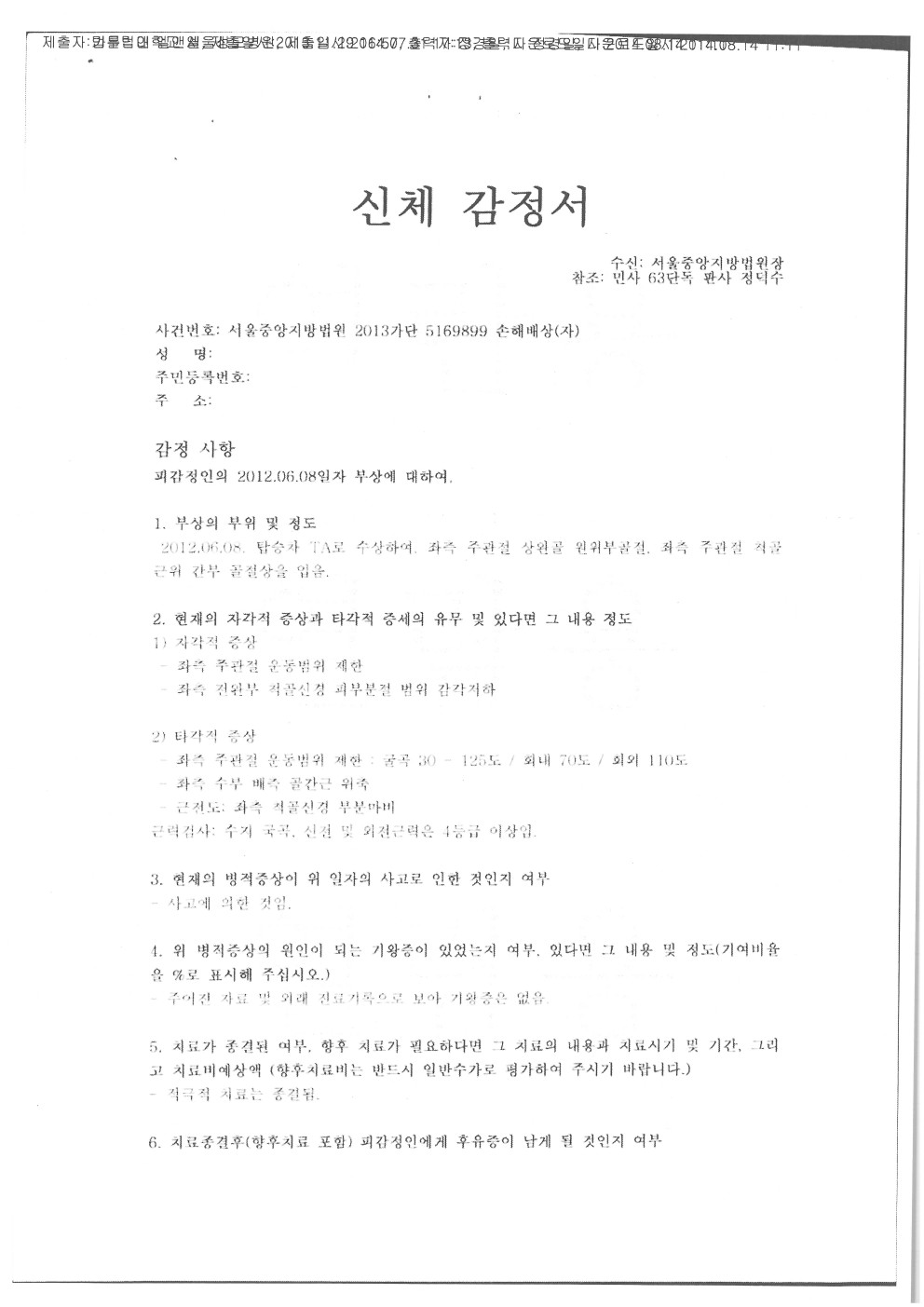 순천향대병원 [후유장해-전방 십자인대 파열, 양측 회전근개 파열]