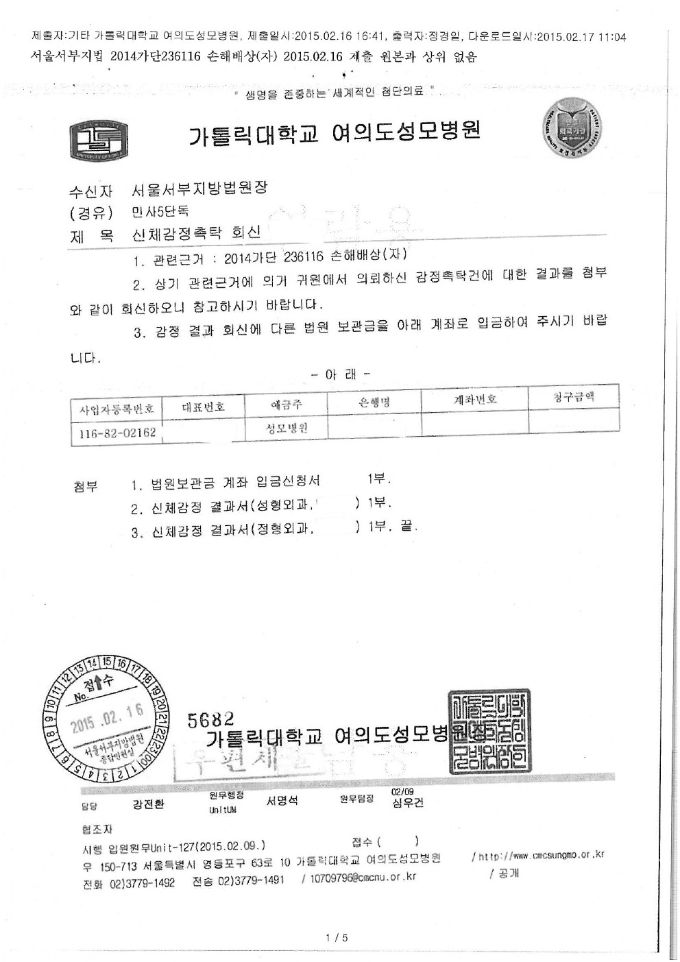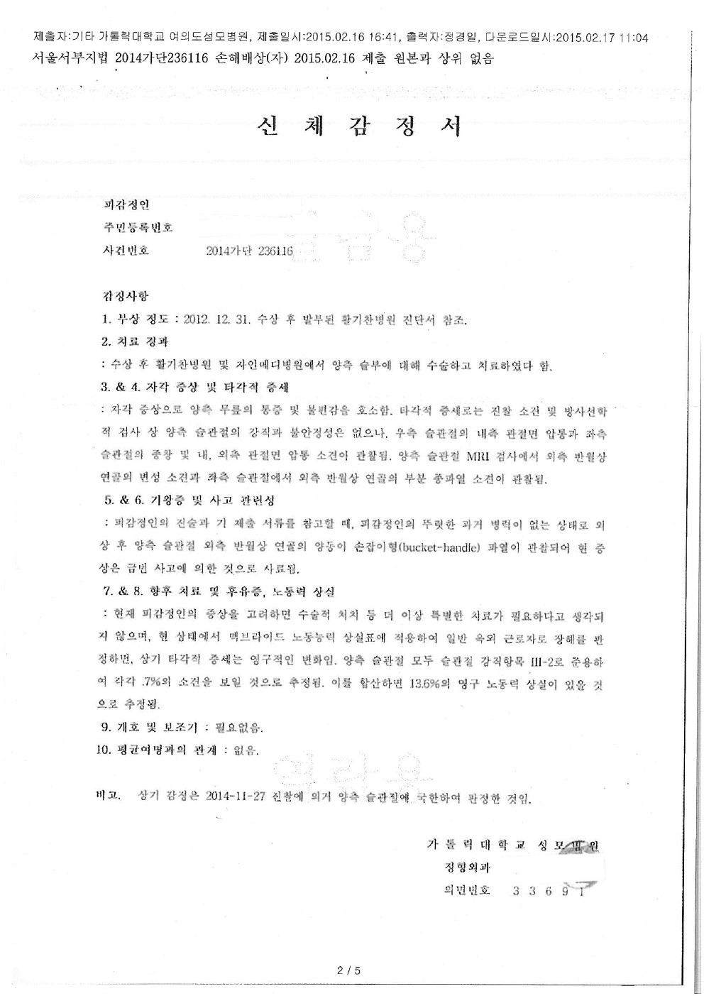 카톨릭대 성모병원[후유장해-추간판 탈출증 유합술]