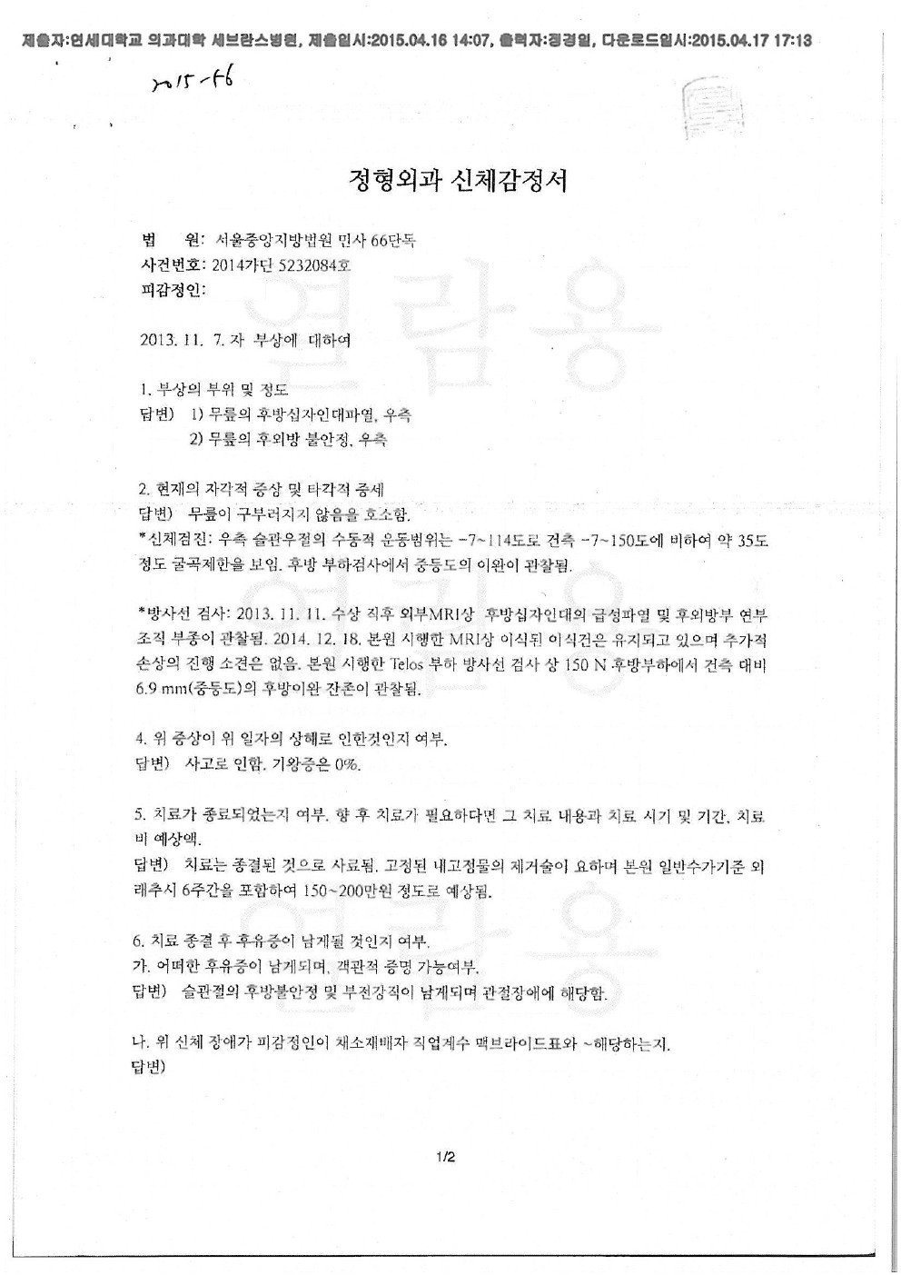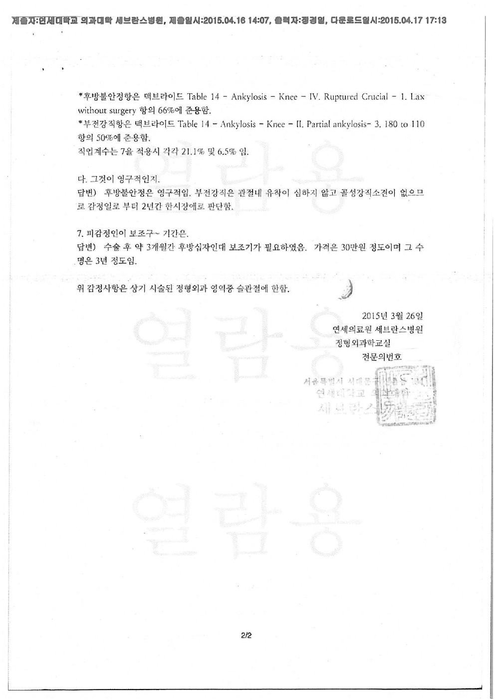 연세의료원 세브란스병원 [후유장해-후방십자인대 파열, 슬관절 강직]