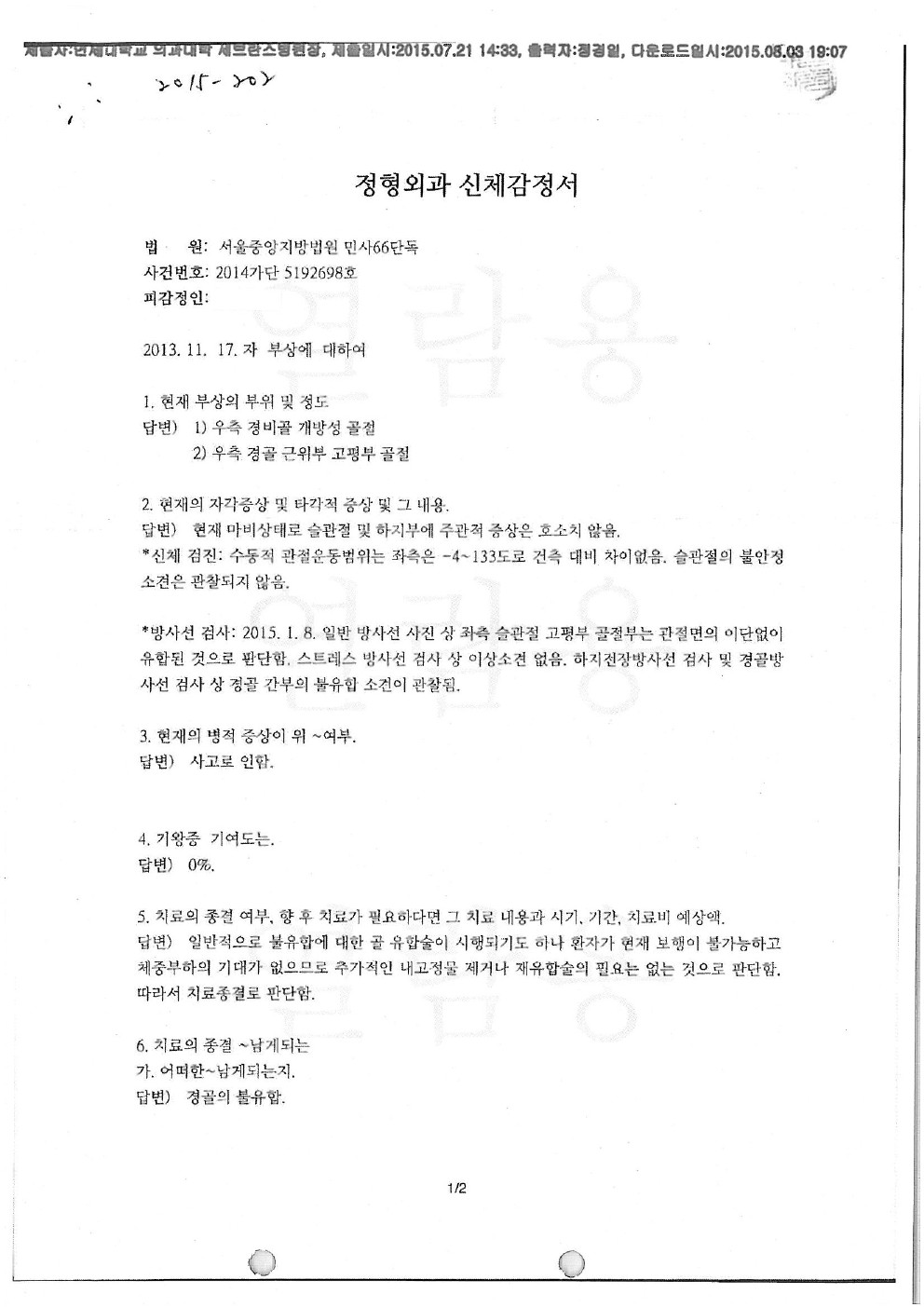 순천향대 서울병원 [후유장해-후방십자인대 파열 및 슬관절 강직]
