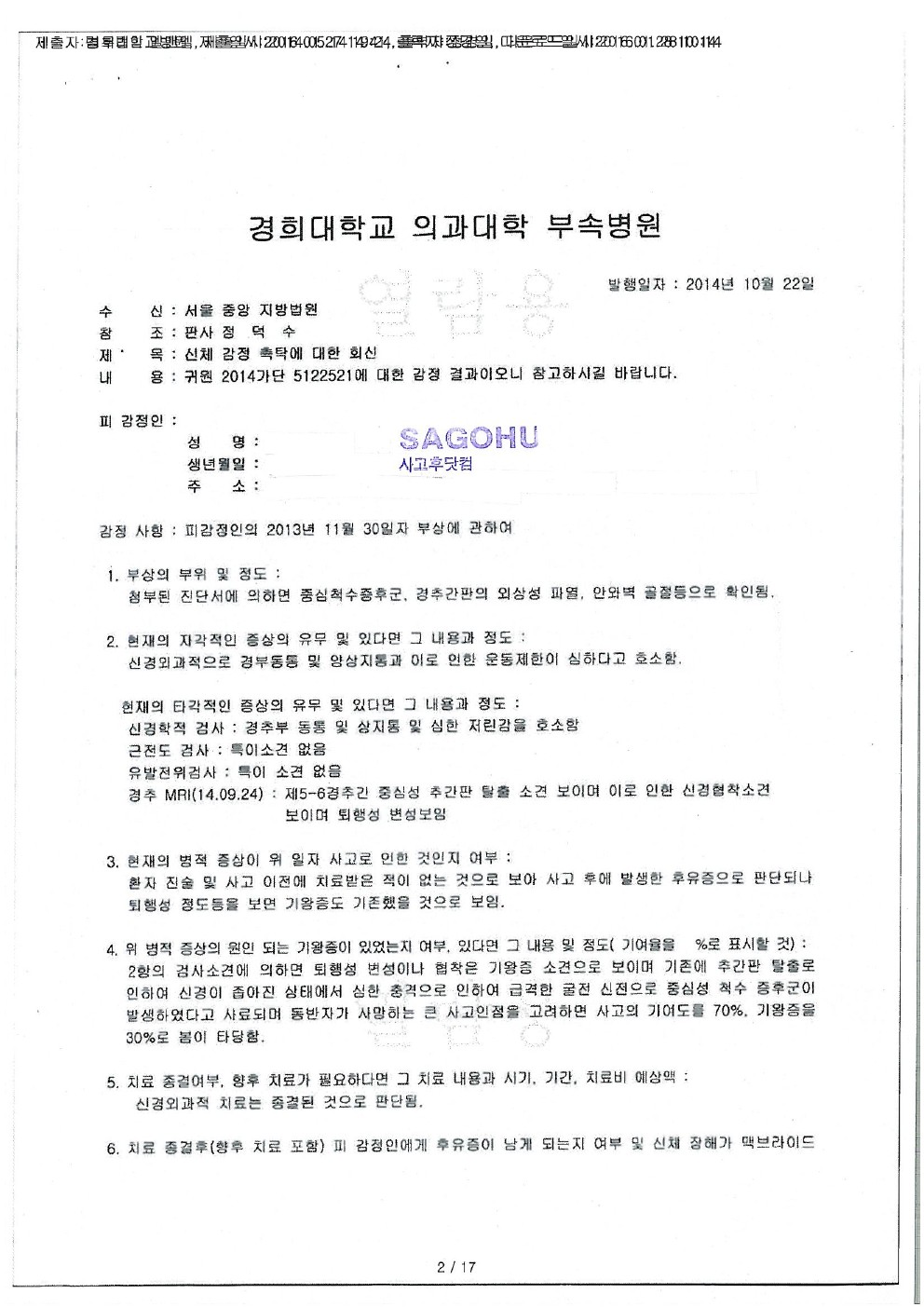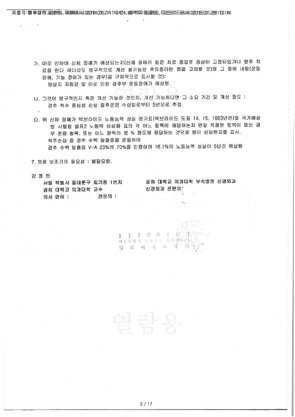 경희의료원 [후유장해- 제3요추 방출골절 고정술 및 후방 감압술]