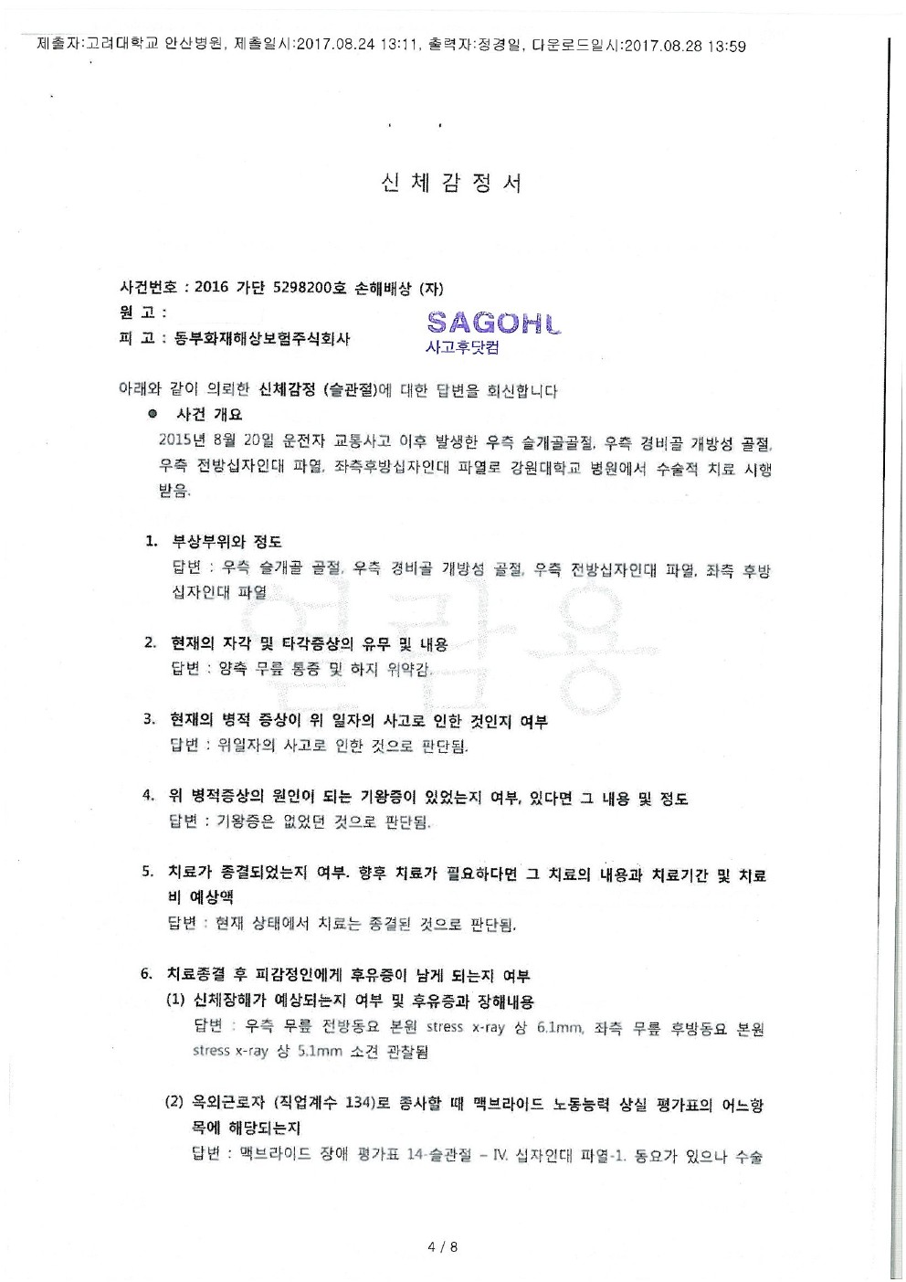 순천향대 서울병원[후유장해 -외상성 혈흉]
